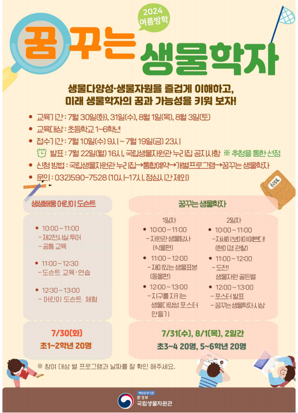 서민환 국립생물자원관장은 “이번 여름방학 생물다양성교육을 통해 어린이와 청소년들이 생물다양성의 중요성을 깨닫고 미래 전문가의 꿈을 키우는 계기가 되길 바란다”라고 밝혔다.