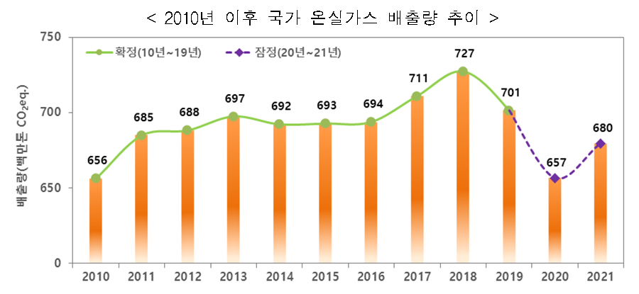 2021년 온실가스 잠정배출량은 6억 7,960만톤으로, 전년보다는 3.5% 증가했으며, 배출정점을 기록한 2018년보다 6.5% 낮게 나타났다.