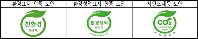 | 환경표지 인증 도안 환경성적표지 인증 도안 저탄소제품 도안(환경부 제공) |