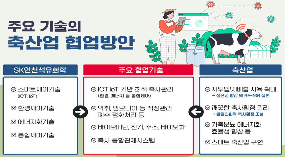 또한, 축산업의 가장 골칫거리인 악취와 축산폐수 문제를 정유/석유화학 에너지 공정과 폐수처리 등 기업이 보유하고 있는 환경관리 기술을 축산업에 접목해 정보통신기술(ICT)과 사물인터넷(IoT)에 기반한 가축의 사양관리와 축사 악취제어, 정화처리의 효율성 향상 등 데이터에 기반한 환경친화적 축산업 모델 마련이 가능할 것으로 보았다.