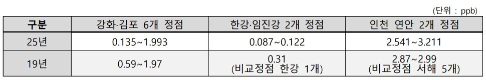또한 19년 대비 추가 조사한 한강·임진강 하구 2개 정점과 인천 연안의 2개 정점에 대한 우라늄 농도 분석 결과 역시19년 비교정점에 비해 유의미한 차이가 확인되지 않았다.