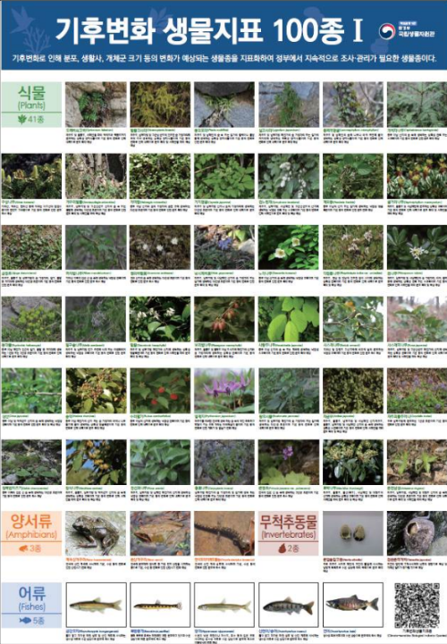 환경부 소속 국립생물자원관은 기후변화에 따른 생물종의 변화를 관측하기 위해 '국가 기후변화 생물지표종' 100종을 갱신해 30일부터 '한반도의 생물다양성 누리집'에 공개한다고 밝혔다.