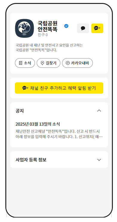 오픈 채널방을 이용한 신고는 카카오톡에서 ‘국립공원 안전똑똑’을 검색하여 참여할 수 있다. QR코드 신고는 국립공원 내 탐방지원센터, 화장실 등 120곳의 주요 시설물과 탐방로의 주요 안내간판에 부착된 QR코드를 탐방객이 휴대폰으로 촬영하면 바로 신고할 수 있다.
