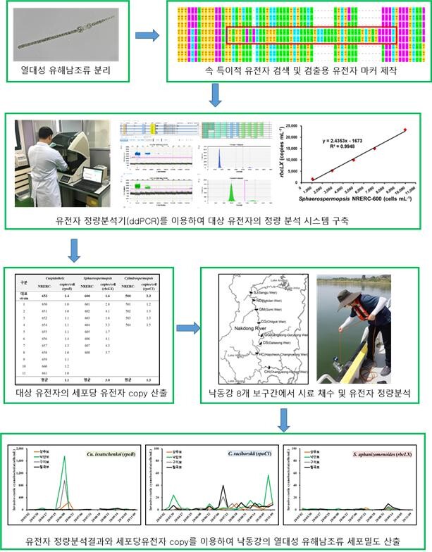 먼저 낙동강에서 열대성 유해남조류 4종 27주를 분리하고 각각의 유전정보를 분석해 2019∼2021년 미국 생물공학정보센터(NCBI)에 등재했다. 이러한 유전정보를 이용해 속 특이적(genus-specific) 유전자 마커와 관련된 독소 유전자 마커 총 8세트를 세계 최초로 개발했다.