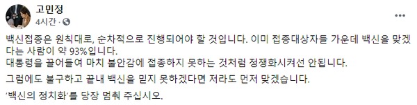 고민정 "백신의 정치화를 당장 멈출 것… 끝내 백신 못믿으면 저라도 먼저 맞겠다"