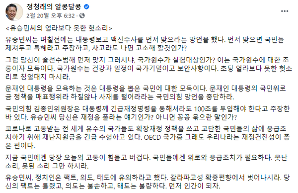 이어 “백신이 안전하다면 대통령의 1호 접종은 오히려 청와대가 나서서 추진할 일인데도, 대통령이 실험대상이 아니라며 발끈하는 정청래 의원의 헛소리야말로, 스스로 AZ 백신의 위험성을 자인하는 꼴밖에 되지 않는다”라고 했다.